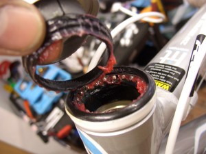 この部分が緩むと走りだしてからパキパキ音の原因になります。ねじ山のチェックして、グリスアップして