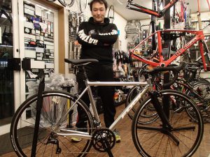 本日のご納車です。 ’18 FUJI NAOMI ポリッシュアルミニウムが眩しいロードをご納車です。 フラットペダルもきっちり手抜きせずに、フレームと同じアルミ仕上げのモノをチョイスして頂きました。 初回点検にてお待ちしております。ありがとうございます。