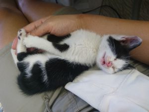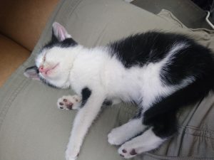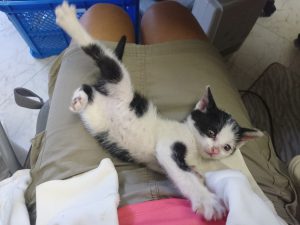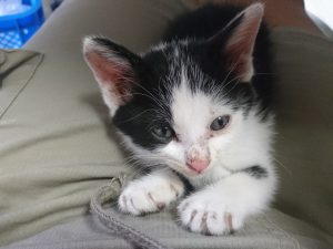 まだ大きな音なんかにはびっくりしてかくれちゃったり、人が多いと怖くて震えちゃったりしますが、保護した時とはすでに別ニャンになりました。