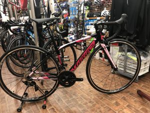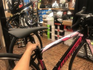 カーボンフォーク・アルミフレームのシマノ105完成車。 入門車としても人気のロードバイクで小柄な方に嬉しいサイズ。 最初からヒルクライムまで可能なギヤ設定になっており、 いろんなところへサイクリングに行ける仕様です! 適正サイズで合わせるとサドルの高さが 画像の場所くらいになると思います。