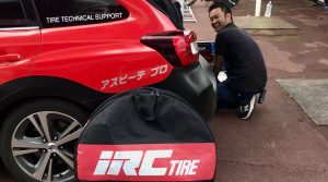 IRCタイヤロゴの奥にレースメカと言えばの西メカニック。